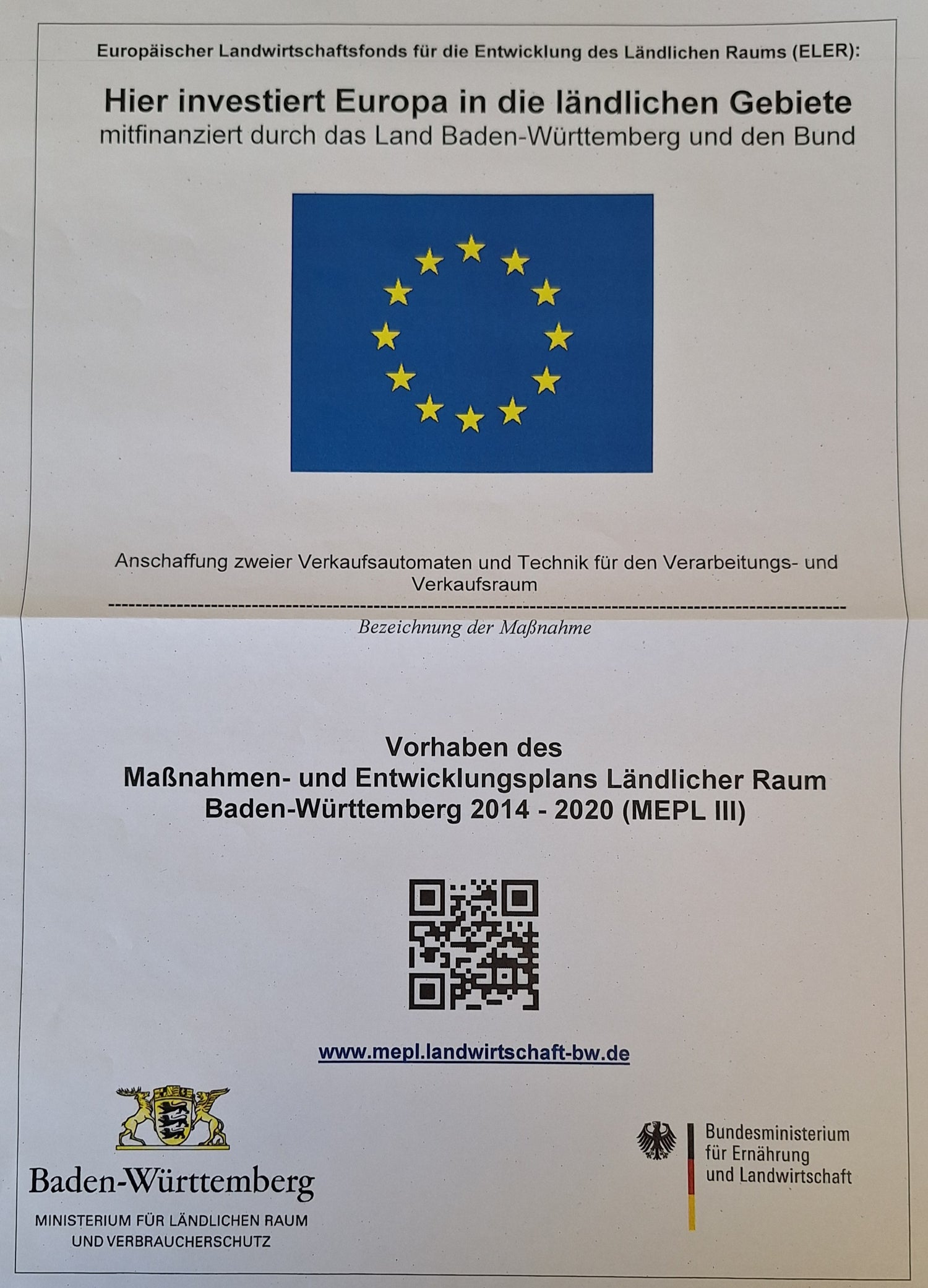 Unsere Verkaufsautomaten und die Technik für den Verarbeitungs- und Verkaufsraum wurde gefördert durch den Maßnahmen- und Entwicklungsplan Länlicher Raum Baden-Württemberg 2021-2020 (MEPL lll).